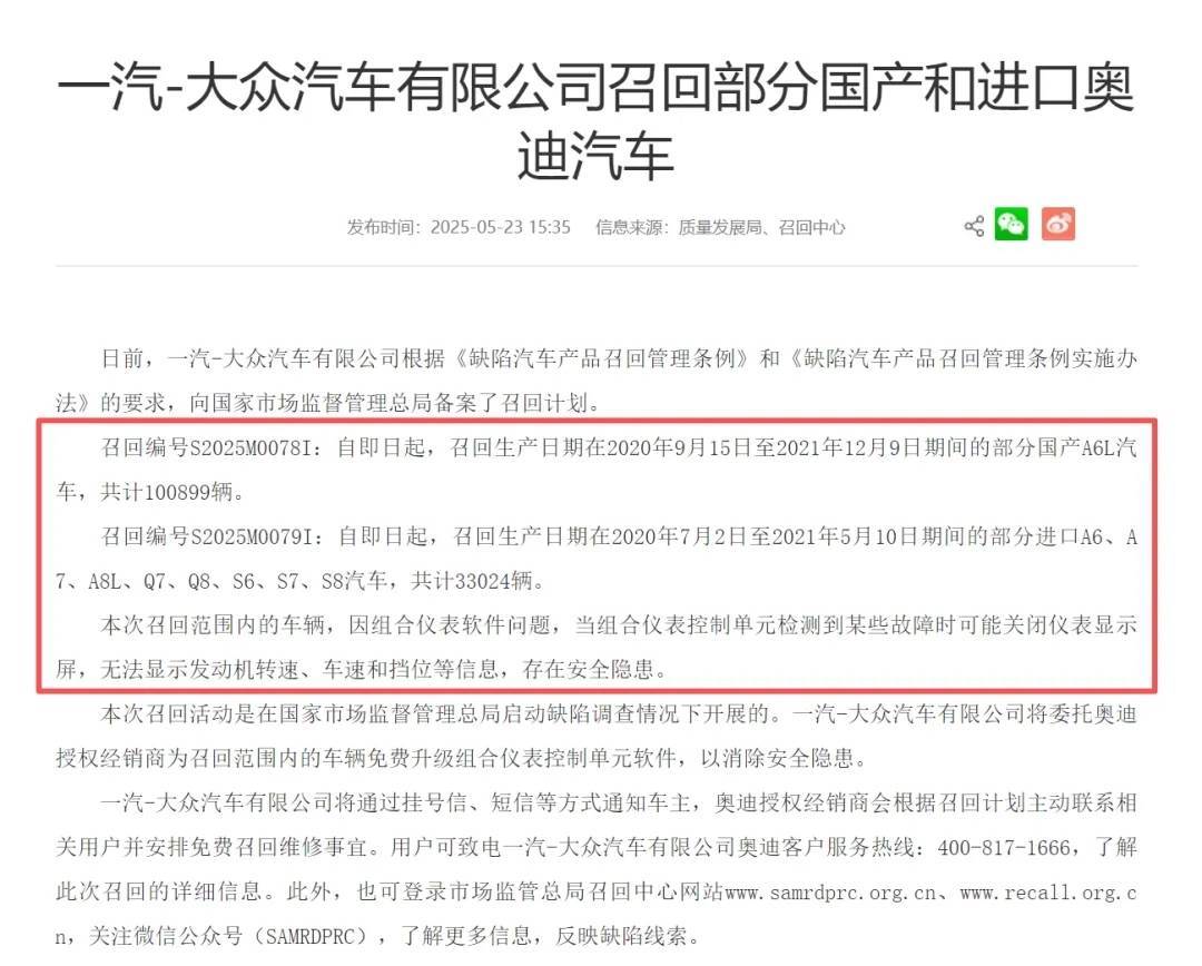 质量问题频发,直接冲击了奥迪的市场表现。2024年,一汽奥迪全年销量仅61.1万辆,同比暴跌12.5%,创下近年新低。而自2024年以来,一汽大众已发起八次涉及奥迪的召回,问题涵盖发电机、电池模组、制动踏板乃至安全气囊。